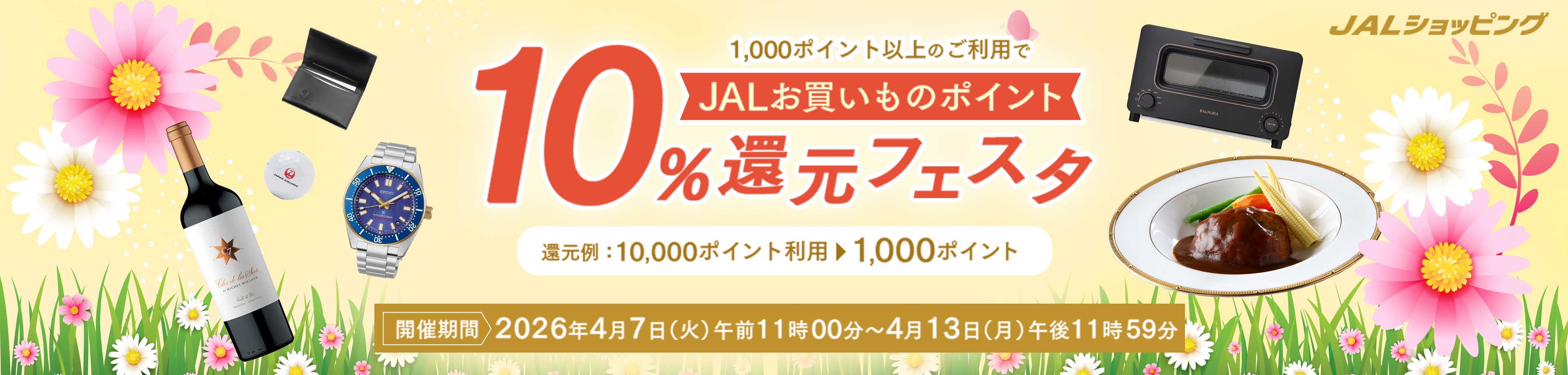 JALお買いものポイント1,000ポイント以上のご利用で、ご利用ポイントの10%をポイントで還元。
