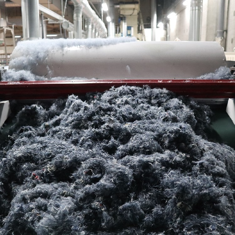2.カットした生地を反毛機械に通してわた状に戻す。