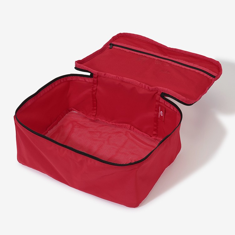 マチがしっかりある安心の収納力。Mサイズがレッド、Lサイズがベージュです。本体の色とバイカラーに配しているファスナーテープがアクセント!Lサイズは〈3606K〉でご紹介しています。