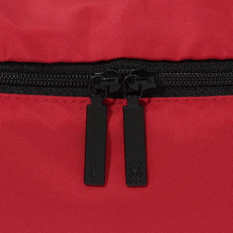 ダブルファスナーだから開閉が簡単で旅先でもストレスフリー。さらにファスナーのひき手にはかわいいクマちゃんのワンポイントとファミリアの刻印が!