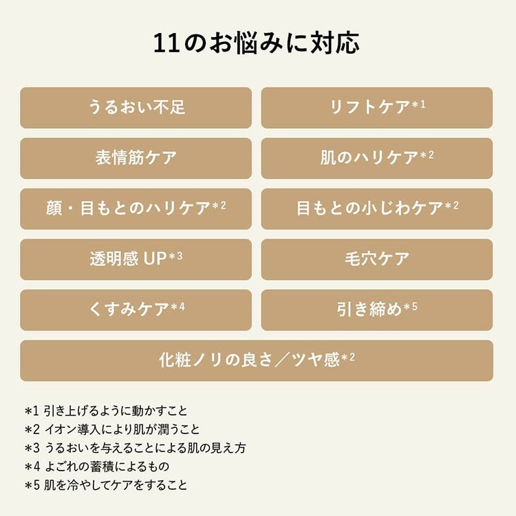 うるおい不足、リフトケア*1、表情筋ケア、肌のハリケア*2、顔・目元のハリケア*2、目元の小じわケア*2、透明感UP*3、毛穴ケア、くすみケア*4、引き締め*5、化粧ノリのの良さ・ツヤ感*2
