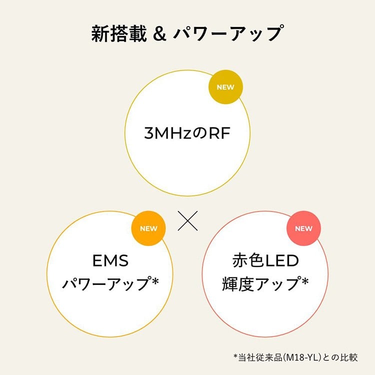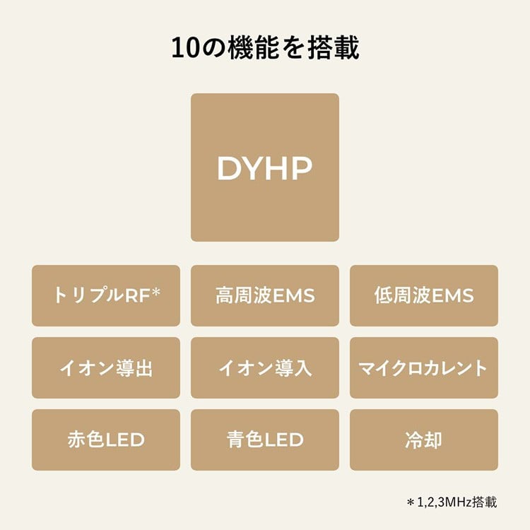 独自技術DYHP、1-3MHzのトリプルRF、パワーアップしたEMS*8、輝度3倍の赤色LEDで、うるおいとハリに満ちた肌へと導きます。
