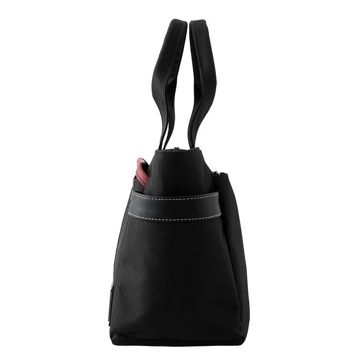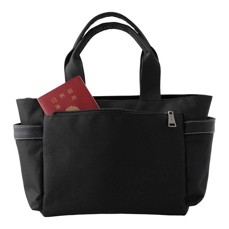 ●サイズ(約):幅24.5(底面)×マチ14×高さ22cm、ハンドル/高さ16cm ●重量(約):428g ●素材:表地/ポリエステル、裏地/ポリエステル ●仕様:開閉=ファスナー式、外側/マグネットホックポケット×1、ファスナーポケット×1、オープンポケット×2、内側/ファスナーポケット×1、オープンポケット×2 ●中国製