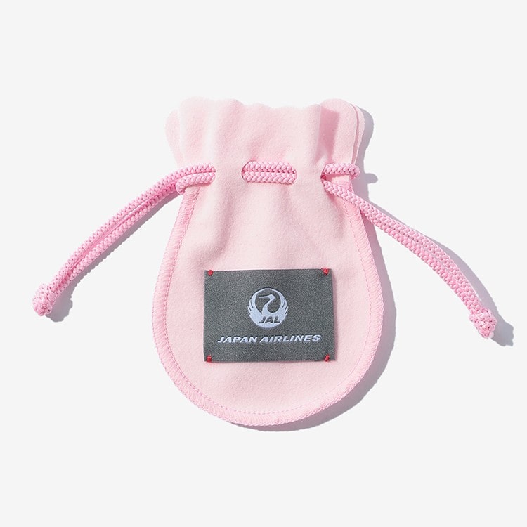 4箇所を赤い刺繍糸で縫い留めしたJALネーム付きの巾着を特別にご用意しました。
