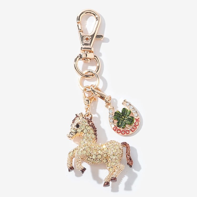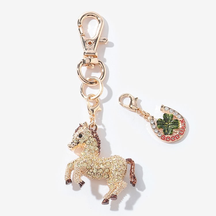 大地を悠々と駆け抜けるウマは、富の象徴であるだけでなく、その力強く走る姿から、生命力や飛躍を意味し、また親子や家族、群れで過ごす性質から家族愛、絆、繋がりの意味を持ちます。そのラッキーな意味合いを持つウマの特徴でもある、力強く流れるようなフォルムに、輝くクリスタルを施すことで煌めきを、そして風になびくたてがみと長くしなやかな尻尾は、エナメル仕上げを施すことで、躍動感を演出しています。そしてもう一つの幸運を呼ぶチャームとして、魔除けや邪気を払い、幸せが舞い込むとされる馬蹄に、四つ葉のクローバーを重ね、赤い「GOOD LUCK」の文字が添えられています。