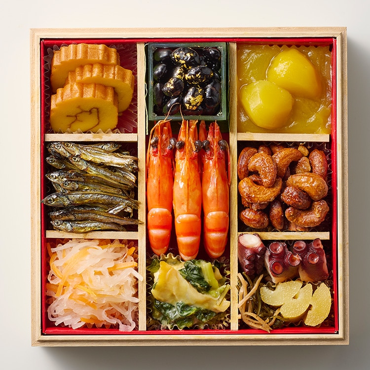 伊達巻、 金箔黒豆、芋きんとんと甘露栗(栗2個)、 田作り、浜汐海老、カシューナッツの飴炊き、紅白なます、つぶ貝と小松菜の鉄ぱえ、蛸柔煮、数の子入り松前漬