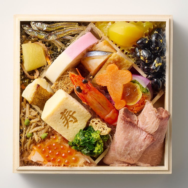 数の子入り松前漬、田作り 、芋きんとんと甘露栗(栗1個)、金箔黒豆、ちりめん山椒煮、紅白なます いくら添え、ローストビーフ(ソース付)、カラスガレイ西京焼 、市松かまぼこ 、きびなご手綱、鶏くるみ松風、飛行機型にんじん旨煮、鶏の麹味噌焼、寿高野豆腐 、浜汐海老、彩りきぬた巻、焼目ゆば巻、菜の花福良漬