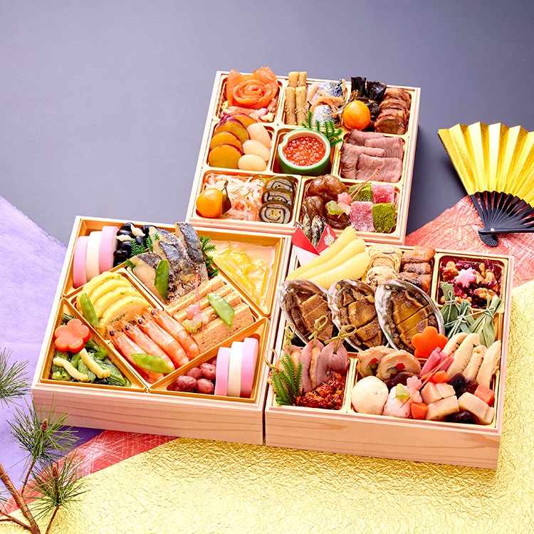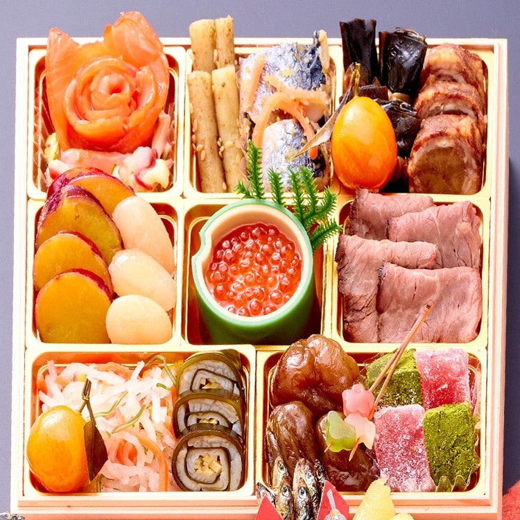 サーモントラウトフラワー、北寄貝とあおさのジュレ和え、たたきごぼう、にしん甘酢漬、一口にしん昆布巻、牛肉八幡巻、葉付金柑、紅あずま甘露煮、白花豆煮、いくら醤油漬、いかうに和え、黒仕込みローストビーフ、彩り大根なます、龍飛巻、いちじく甘露煮、わらび餅(抹茶)、わらび餅(あまおう)、松竹梅串