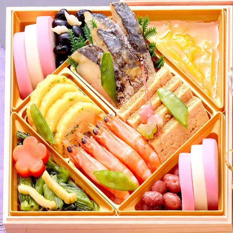 かまぼこ(白)、かまぼこ(赤)、ちょろぎ(白)、黒豆煮、さつま芋きんとん(栗甘露煮入り)、きぬさや、さわら西京焼、出汁巻、鶏松風、祝海老、花形人参、小松菜と揚げの煮物、金時豆、松竹梅串