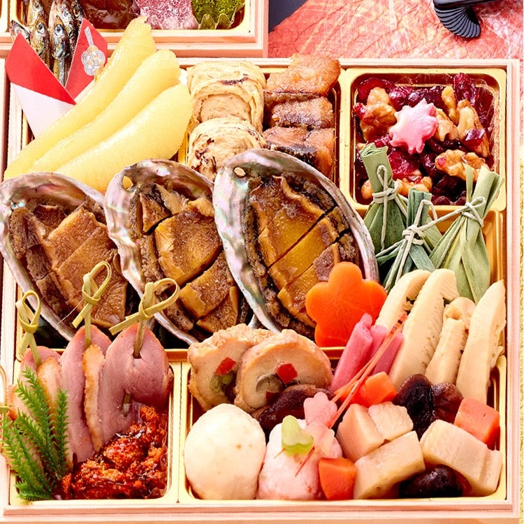 のし田作り、味付数の子、数の子松前、一口焼湯葉巻、鱈煮、クランベリーくるみ、桜色麩、アワビ旨煮、花形人参、釜揚げわかめ、笹巻茶巾、合鴨スモーク串、真だら子旨煮、鶏三色巻、かにとくわいのしんじょ、えびと枝豆のふわふわしんじょ、梅酢レンコンの芽、厚切り筍旨煮、人参旨煮、蓮根旨煮、椎茸旨煮個、松竹梅串