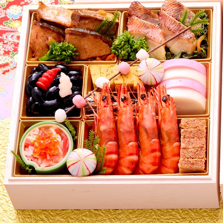 鰤照焼、きんぴらごぼう、味付菜の花、赤魚西京焼、わさび菜のお浸し、黒豆蜜煮、千代呂木酢漬(赤)、千代呂木酢漬(白)、フリッタータ、田作りカシューナッツ和え、かまぼこ(白)、かまぼこ(赤)、いくら醤油漬、紅白なます、海老旨煮、トリュフ入りレーズン松風、手毬餅、花餅