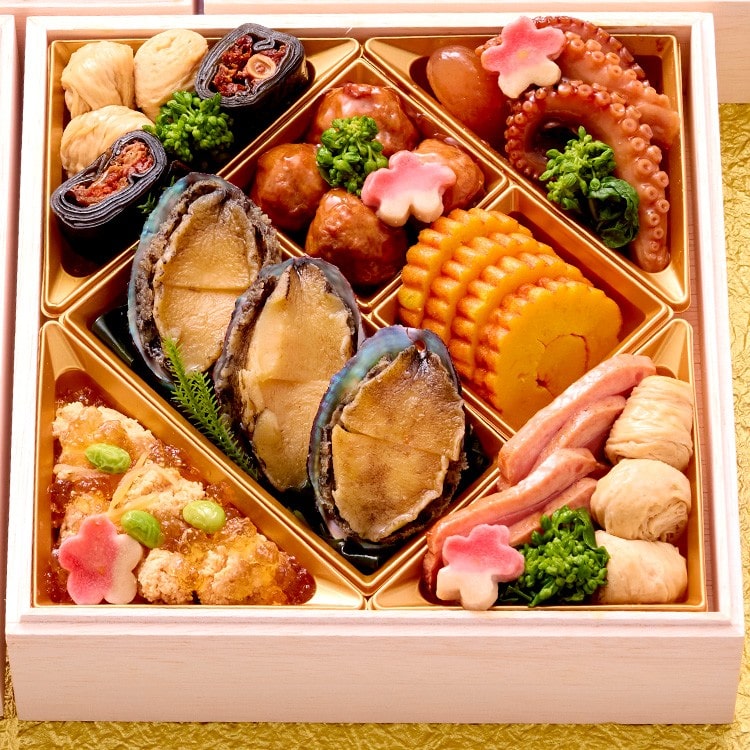 手毬湯葉、鮭骨昆布巻、蛸やわらか煮、玉こんにゃく旨煮、合鴨団子、高野豆腐含め煮、伊達巻柚子風味、鮑生姜煮、だし若布、鰤の子生姜煮、大根田舎煮、味付枝豆、合鴨ロースからし風味、梅麩、味付菜の花