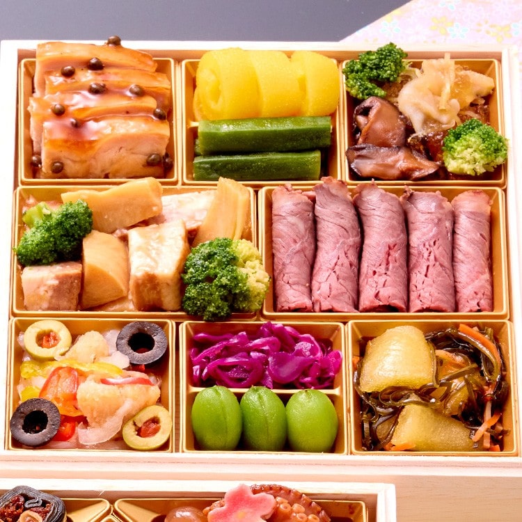 ほたるいかしぐれ煮、鰤しぐれ煮、鰊の黄味酢掛け、玉ねぎ甘酢漬、ミートローフ、スモークサーモントラウトケッパー添え、カリフラワーのピクルス、ペッパードロップ(赤)、ペッパードロップ(黄)、いちじく入りクリームチーズ、渋皮栗甘露煮、五郎島金時のきんとん、鶏の燻製チーズソース掛け、ミックスビーンズコンソメ煮、イカと海藻の彩りサラダ、くるみ甘露煮、炙り烏賊の翡翠味噌掛け、ロマネスコオイル和え