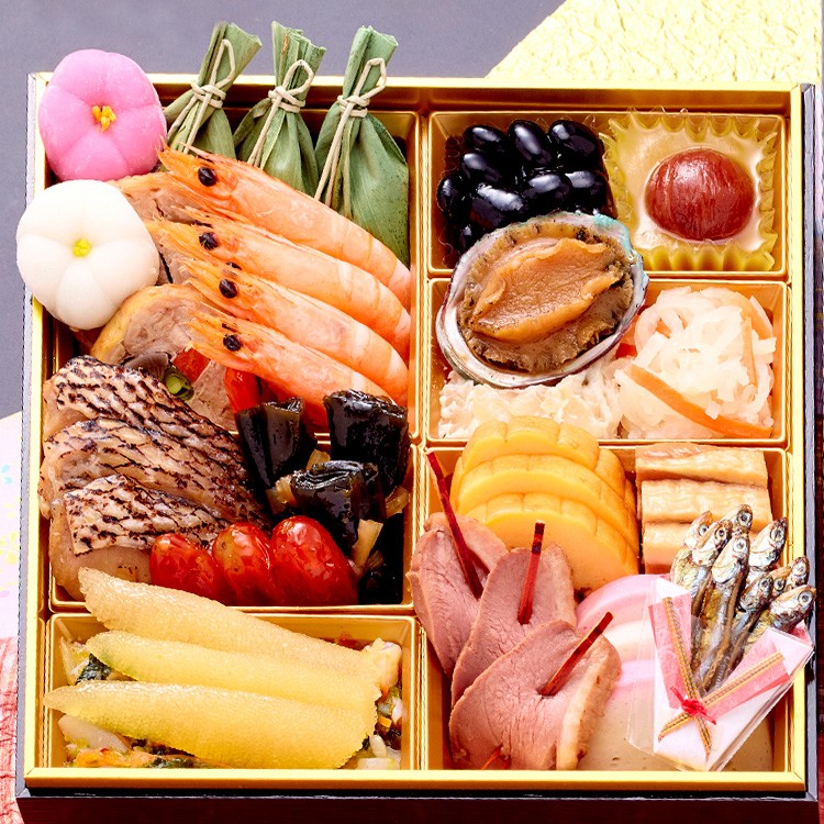 花餅 紅、花餅 白、笹麩茶巾、鶏八幡巻、有頭海老、黒豆煮、きんとん、渋皮栗甘露煮、数の子山海漬、あわび旨煮、紅白なます、真鯛幽庵焼、ドライトマト、一口昆布巻、伊達巻、豚角煮、つぶ貝黄金和え、味付数の子、合鴨山椒串、市松蒲鉾、田作り