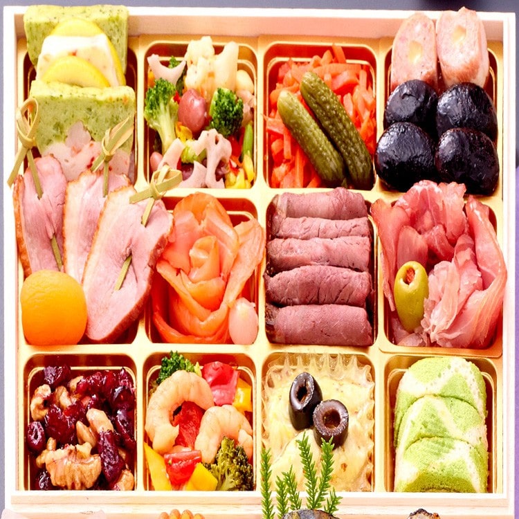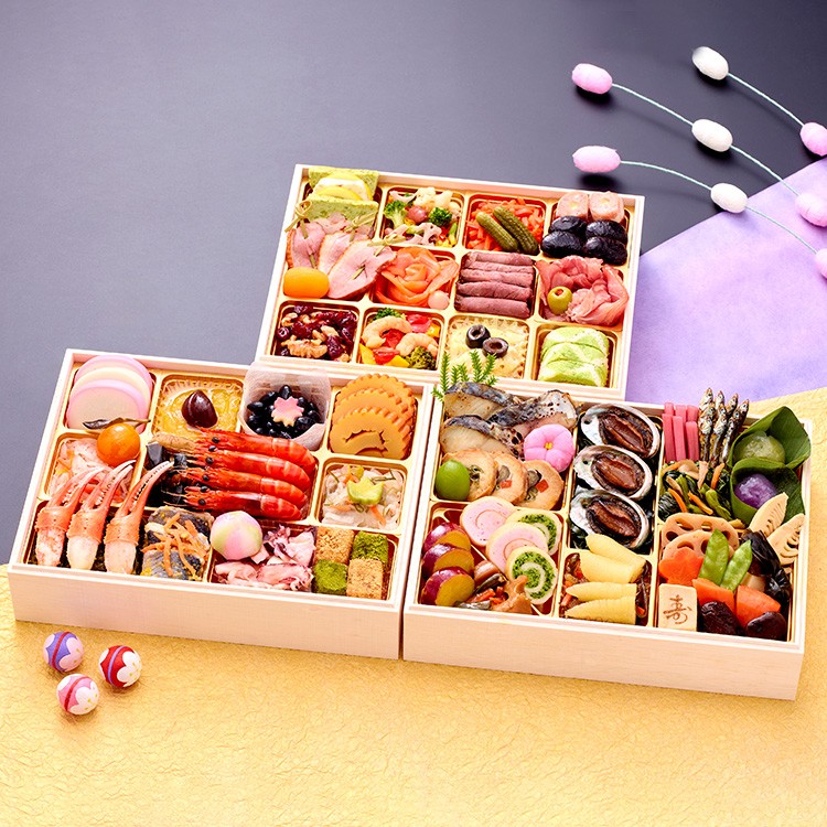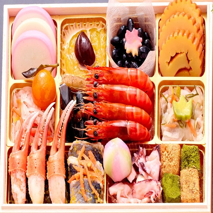 かまぼこ(紅)、かまぼこ(白)、たたきごぼう、にしん昆布巻、きんとん、渋皮栗甘露煮、伊達巻、黒豆煮、桜色麩、紅白なます、金柑甘露煮、祝海老、柚子かぶら、竹麩、ボイル昆布、かに爪、にしん甘酢漬、酢たこ、てまり餅、わらび餅きなこ、わらび餅抹茶