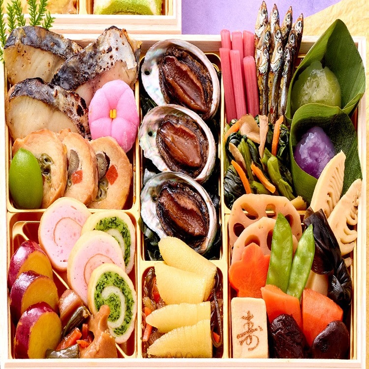 さわら西京焼、若桃甘露煮、若鶏三色巻、アワビ旨煮、釜揚げわかめ、花餅紅梅、田作り、小松菜ときのこの煮浸びし、蓮の芽梅酢漬、笹巻餅(紫芋)、笹巻餅(抹茶)、紅あずま甘露煮、れんこん甘辛和え、なごみ巻(海老)、なごみ巻(ほうれん草)、数の子松前、味付数の子、れんこん煮〆、花形人参、きぬさや、結び昆布、寿高野豆腐、人参煮〆、厚切り竹の子、椎茸煮〆
