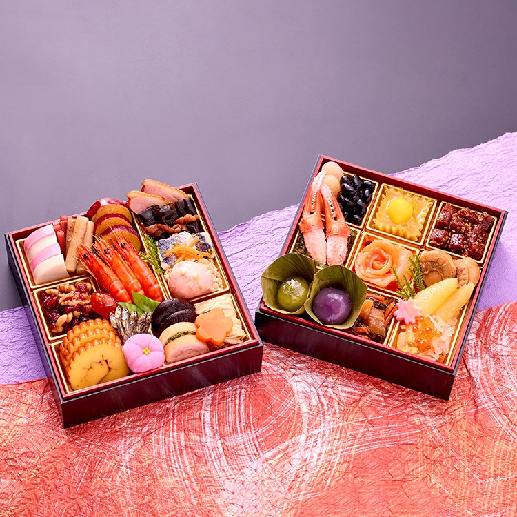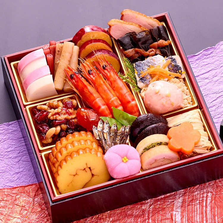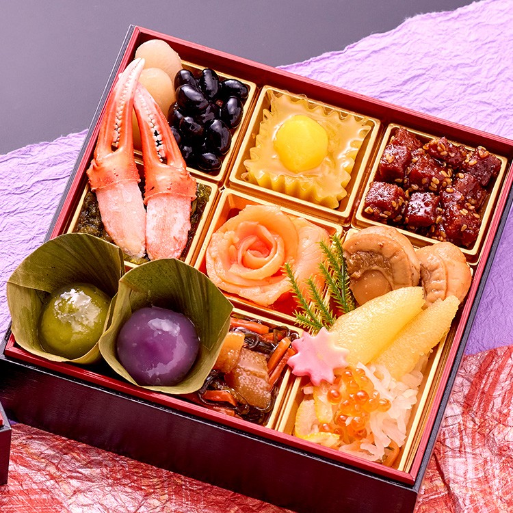 白花豆煮、黒豆煮、栗甘露煮、きんとん、金胡麻鮪角煮、かに爪、ボイル海老、スモークサーモントラウト、焼帆立、笹巻餅(紫芋)、笹巻餅(抹茶)、数の子松前、味付数の子、桜色麩、紅白なます、いくら醤油漬