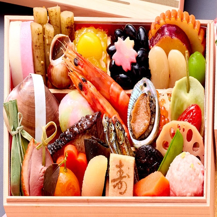 黒豆煮、桜色麩、きんとん、栗甘露煮、蓬麩、ドライトマトワイン煮、伊達巻、白花豆煮、紅あずま甘露煮、若桃甘露煮、紅白なます、いくら醤油漬、煮はまぐり、金柑甘露煮、祝海老、かまぼこ(白)、かまぼこ(紅)、バイ貝旨煮、たたきごぼう、合鴨スモーク串、味付数の子、笹巻茶巾(柚子あん)、てまり餅、田作り、花型人参、ぶり照焼、一口にしん昆布巻、アワビ旨煮、、えびと枝豆のしんじょ、椎茸煮〆、蓮根煮〆、人参煮〆、きぬさや、寿高野豆腐