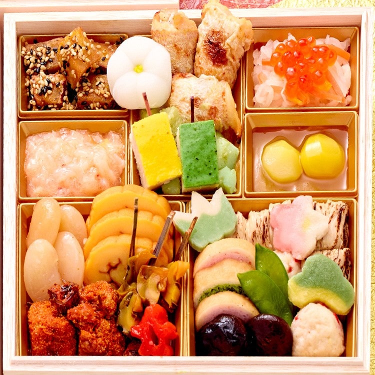 ごまポテト、帆刺玉葱柚子風味、小鯛西京焼、里芋松葉串、ほうれん草松葉串、花餅 白、筍木の芽和え、紅白なます、いくら醤油漬、きんとん、栗甘露煮、白花豆煮、伊達巻、真だら子旨煮、あかにし生姜串、花こんにゃく 赤、かにつみれ、一口焼湯葉、松麩、竹麩、梅麩、椎茸煮〆、きぬさや、新丈巻 海老、新丈巻 ほうれん草