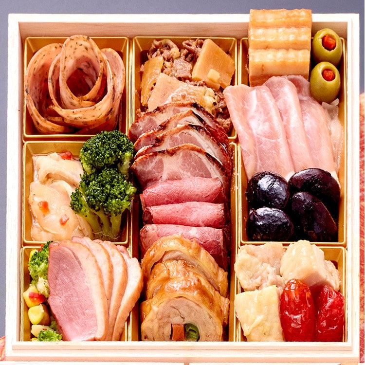 3段のお重の内2つのお重には湯島のシンボル「梅の花」や「松竹梅」をイメージした品を、又「湯島たけうち」のモットー自然と調和する料理をイメージして組み入れました。加えて3段目のお重は元精肉店創業100年超えの歴史の中できずいた肉料理の中から、ローストビーフやポークマリネなども盛り込まれた、若い方に人気のメニューです。