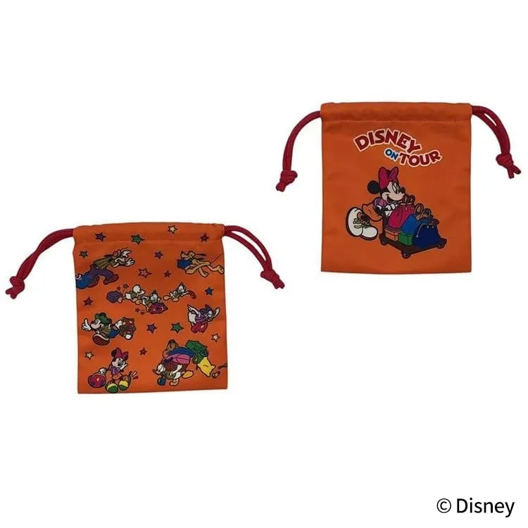 鮮やかな黄色とオレンジが目を惹く巾着2枚セットは、表面にはミッキーマウスとミニーマウス、裏面には旅に出かけるミッキーマウスとその仲間たちがデザインされています。