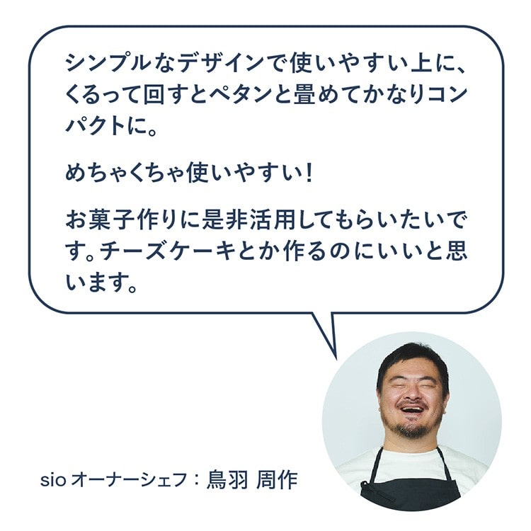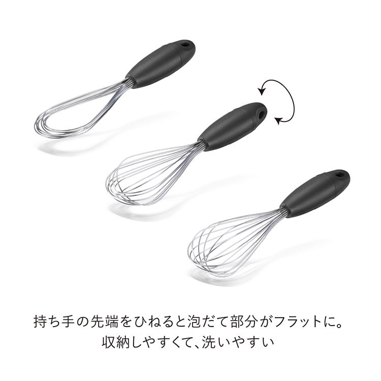 dreamfarm×sioのコラボレーションアイテム。折りたたみ可能な万能泡立て器。持ち手の先端をひねるとワイヤーが3段階に変形。ぺったんこになるので、省スペースでの収納が可能。