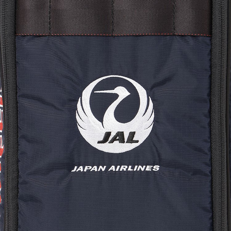 上品なネイビーにホワイトでJALロゴの刺繍を施し、ブリーフィングのロゴをレッドで配置。