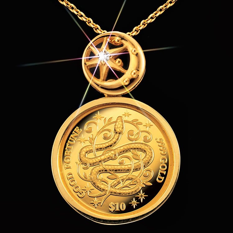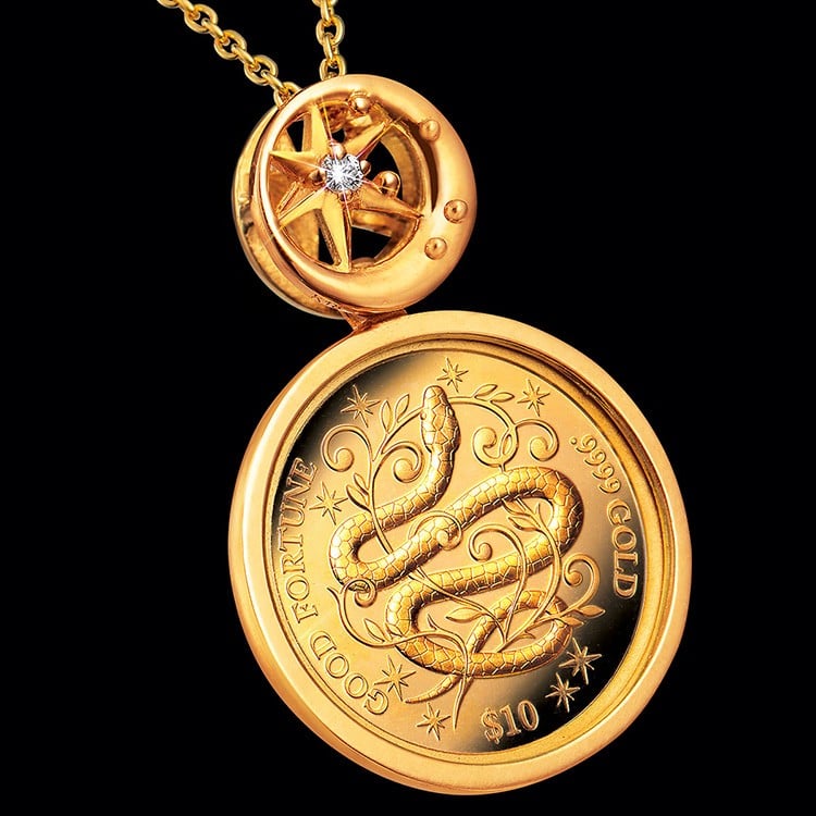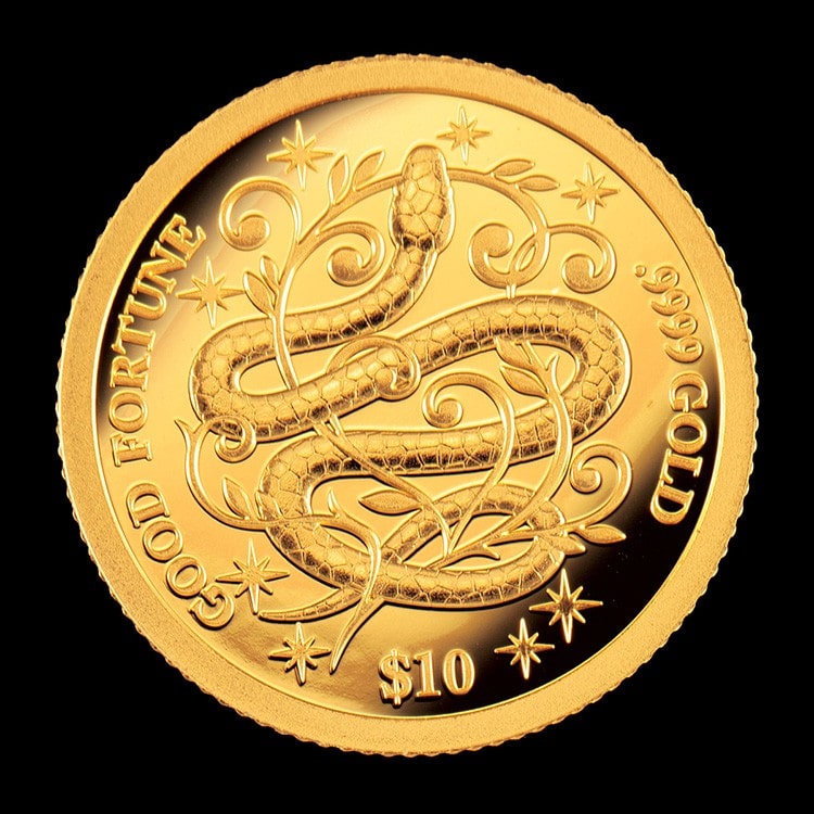 艶やかな鏡面仕上げの貨面に、精緻なレリーフで立体的に表現された蛇と、繁栄や長寿の意味を持つアラベスク文様。蛇がしなやかな身を蔓や草に絡ませているデザインはどこか異国情緒が漂い、洋の東西を問わず神の使いとして崇められている蛇の神々しさにも重なります。