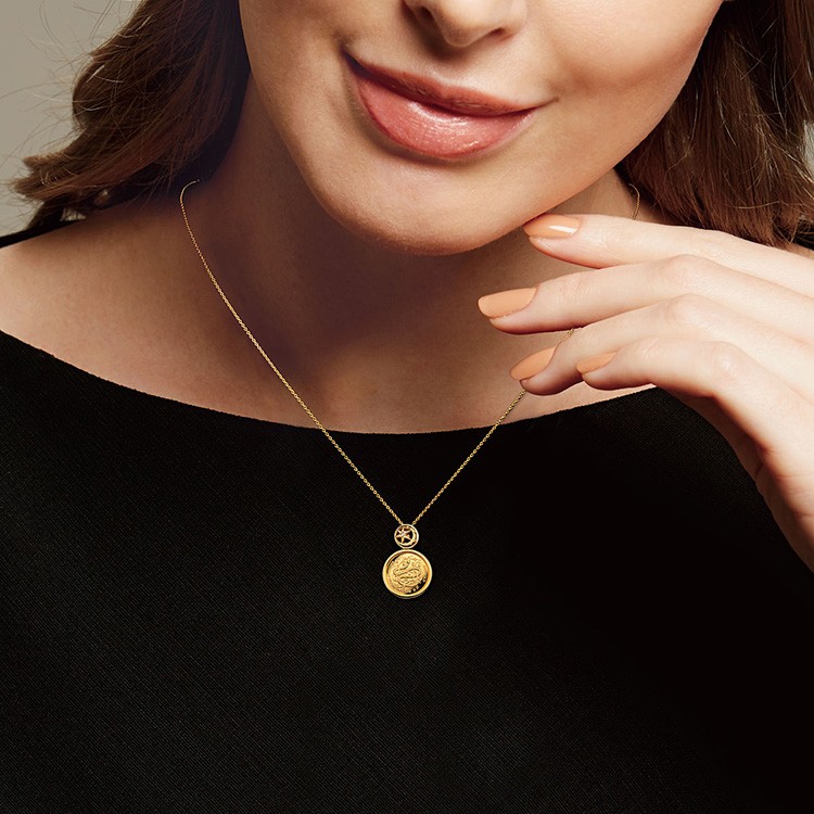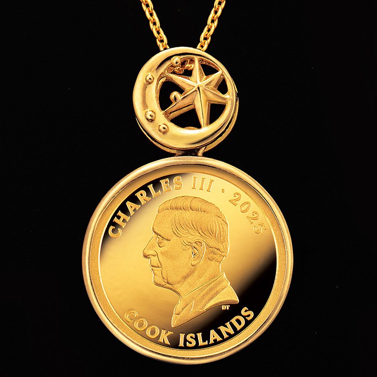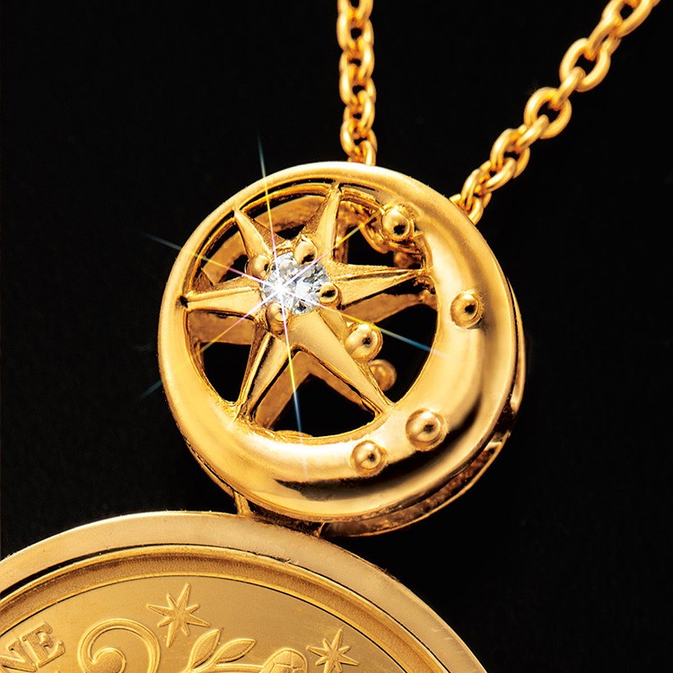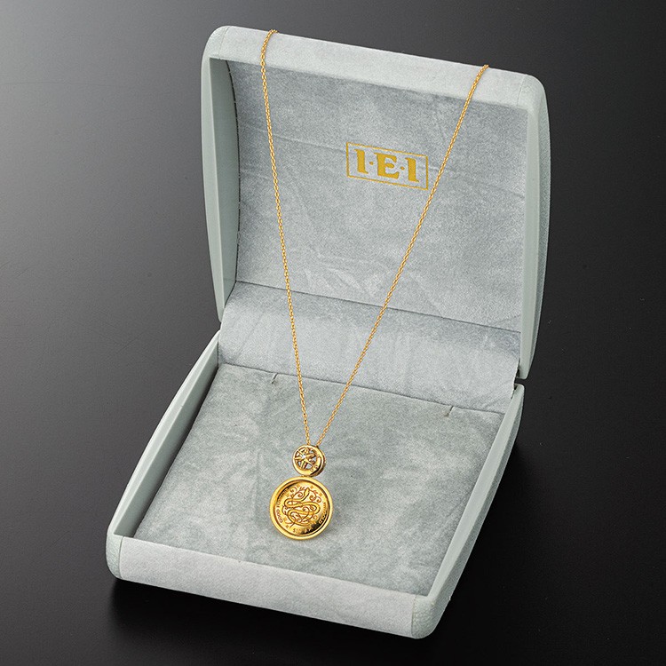 ●サイズ(約):ヘッド/縦21.9×横14.5mm(フレーム含む)、チェーン/最長45cm(フリーアジャスター) ●素材:ヘッド/金貨(品位.9999)、フレーム・バチカン/18金、ダイヤモンド1石(約0.01ct)、チェーン/24金仕上げスターリング・シルバー(925銀) ●日本製、金貨鋳造/マイヤーズ造幣所(ドイツ) ●商品提供元:I・E・I