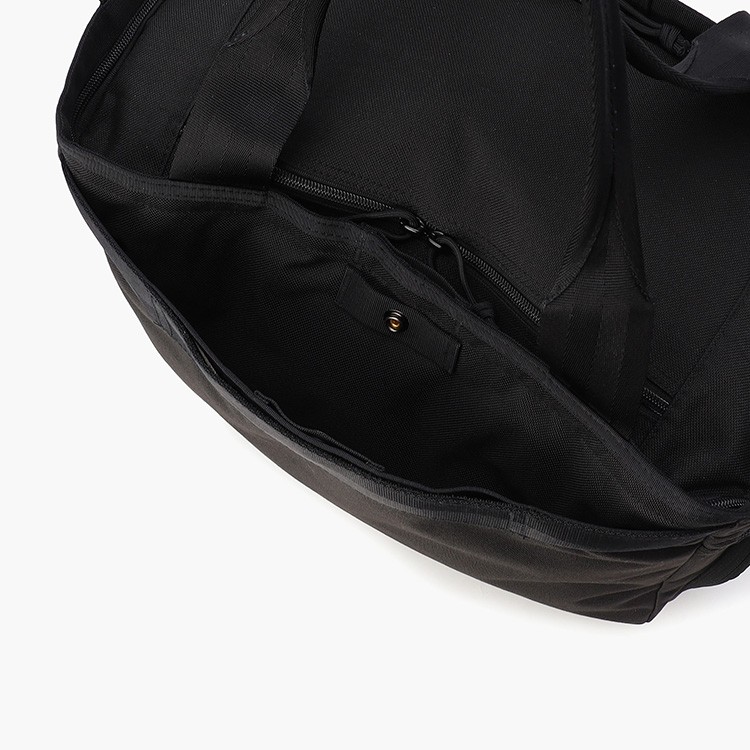 また、開口部センターにはスナップボタンを配し、荷物が少ないときなどはスナップボタンを留めることでマチ幅を調節することが可能。