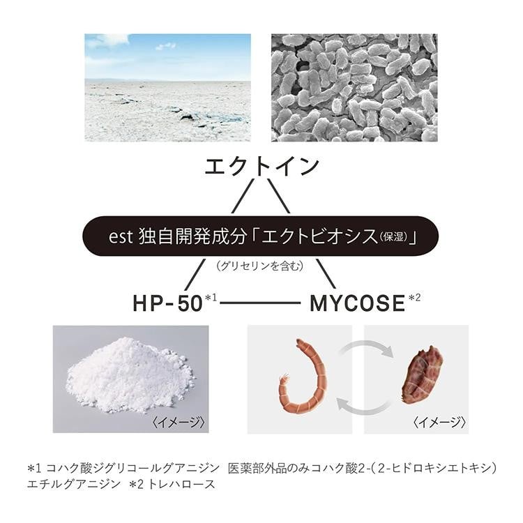 ◆エスト独自成分エクトビオシス配合(保湿:エクトイン、コハク酸ジグリコールグアニジン*2、トレハロース、グリセリン)