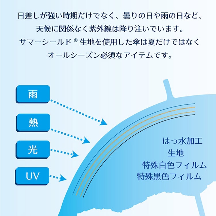 雨の日はもちろん、UV遮蔽率&遮光率100%、体感温度マイナス4℃以上の遮熱性も兼ね備えたハイスペックな晴雨兼用傘です。
