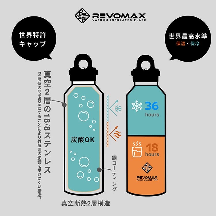 対応可能な飲み物について。ホットもアイスも、炭酸もすべてに対応しております。REVOMAXは通常の炭酸飲料を想定した水筒になりますので、二酸化炭素の量にもよりますが、自家製の強炭酸や市販の強炭酸でご利用の際は、キャップを30分に1回程度開閉してください。下記ご質問の多いドリンクの詳細となります。スポーツドリンク:スポーツドリンクを入れてお使いいただいても構いませんが、ご使用後は十分にお手入れをお願いいたします。アルコール飲料:入れてお使いいただいても構いませんが、ご使用後は十分にお手入れをお願いいたします。アルコール飲料に限らず、飲みものの成分が残ったままですと、ステンレス鋼が腐食(さび発生)し、保冷性能不良の原因となることがあります。お酢やレモン:耐食性の強いステンレスを採用していますので、お酢やレモンでも問題なくご使用いただけます。ただし、傷などが入るとそこから錆ができたりする可能性はあるため取り扱いにはご注意頂き、なるべくお早めにお召し上がりください。牛乳でつくったカフェオレやミルクティー:耐食性の強いステンレスを採用していますので、カフェオレやミルクティでも問題なくご使用いただけます。ただし、長く放置した場合、腐敗、変質したりする可能性がある為、お取り扱いにはご注意頂き、なるべくお早めにお召し上がりください。