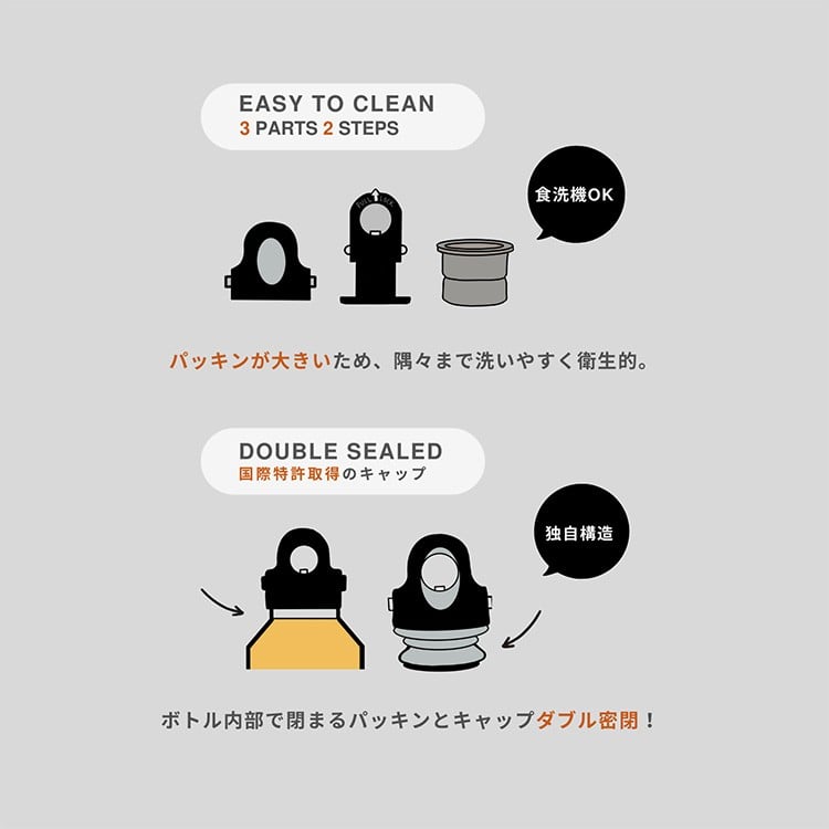 ※ご使用後は放置せず、すぐきれいに洗い、十分乾燥させてください。食洗機でのボトル本体の洗浄はできません。キャップは可能です。ぬるま湯または、ぬるま湯でうすめた食器用洗剤を使用してください。3つのパーツに分解して洗浄して、よく乾かしてから組立てをお願いします。