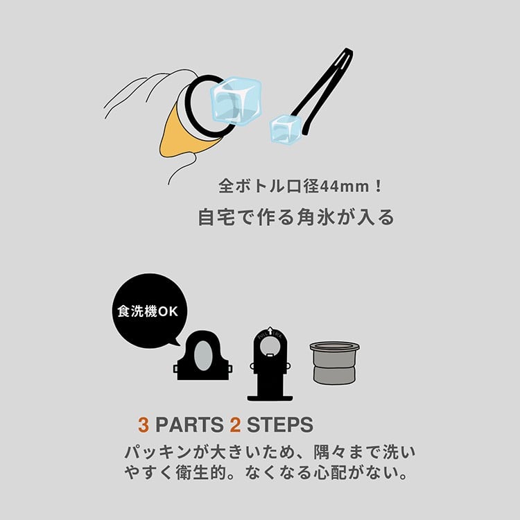 キャップ、リング、パッキンと3パーツに簡単に分かれお手入れ簡単、本体とは別で食洗器対応です。