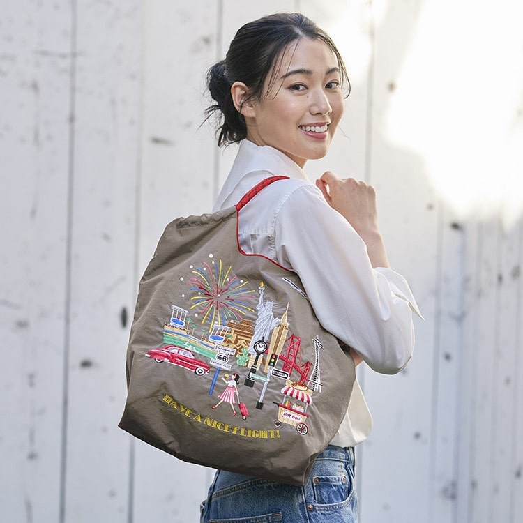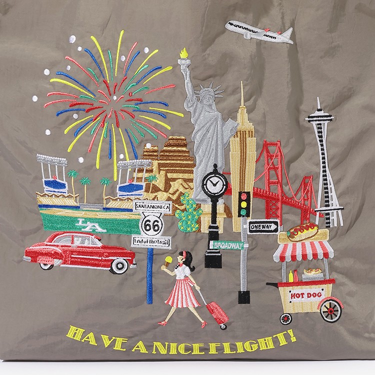 旅の名所と飛行機が色鮮やかな刺しゅうで描かれており、旅気分を盛り上げてくれます。