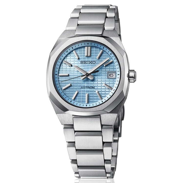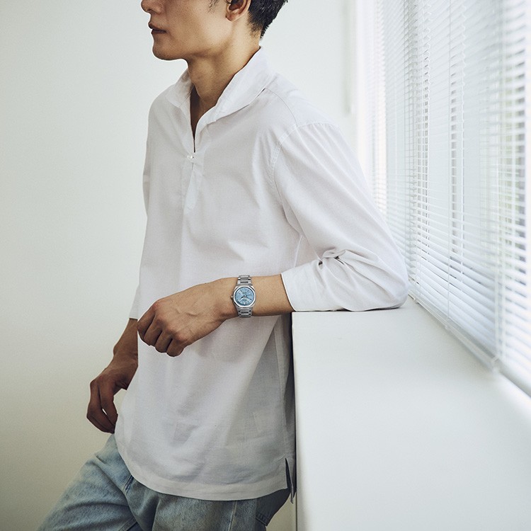 多面カットを施したインデックスと三面カットの時分針、爽やかでトレンド感のあるミントブルーダイヤルには緻密なクリスタルボックスパターンを採用することで、コンパクトサイズならではの高級感のあるデザインを実現しました。