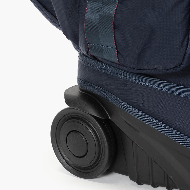 ・キャスターハンドルを完備しながらも、従来並みの容量感にこだわり、両面サイドポケットや前胴側のポケットを拡大することで全体の容量感を調節している。