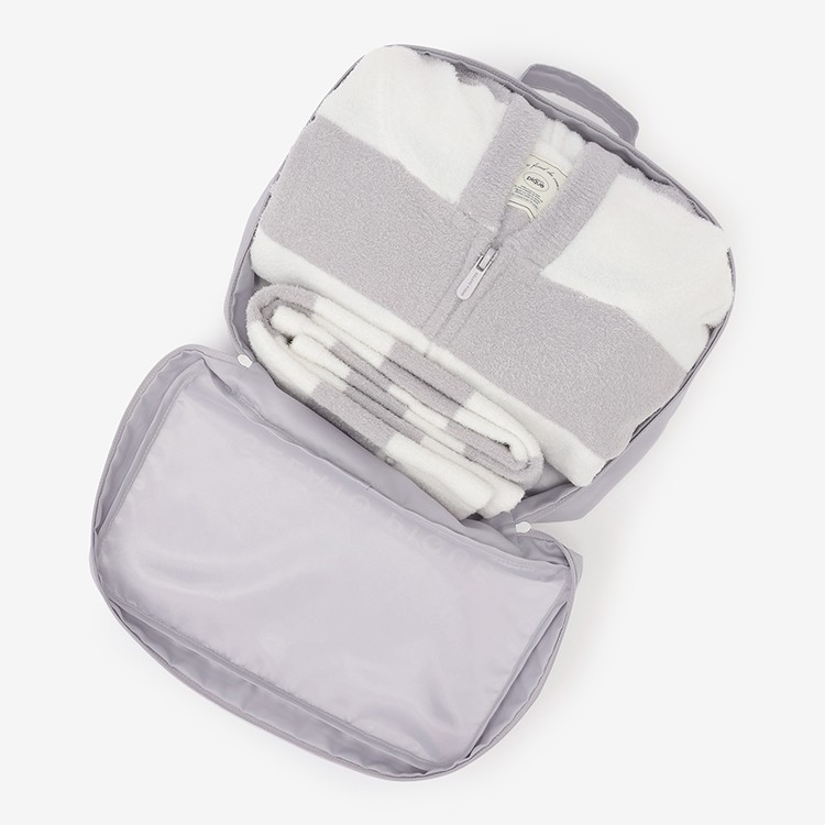 パーカとソックスをまとめてコンパクトに収納できるポーチは、持ち手付き。パッキングケースとしても重宝します。