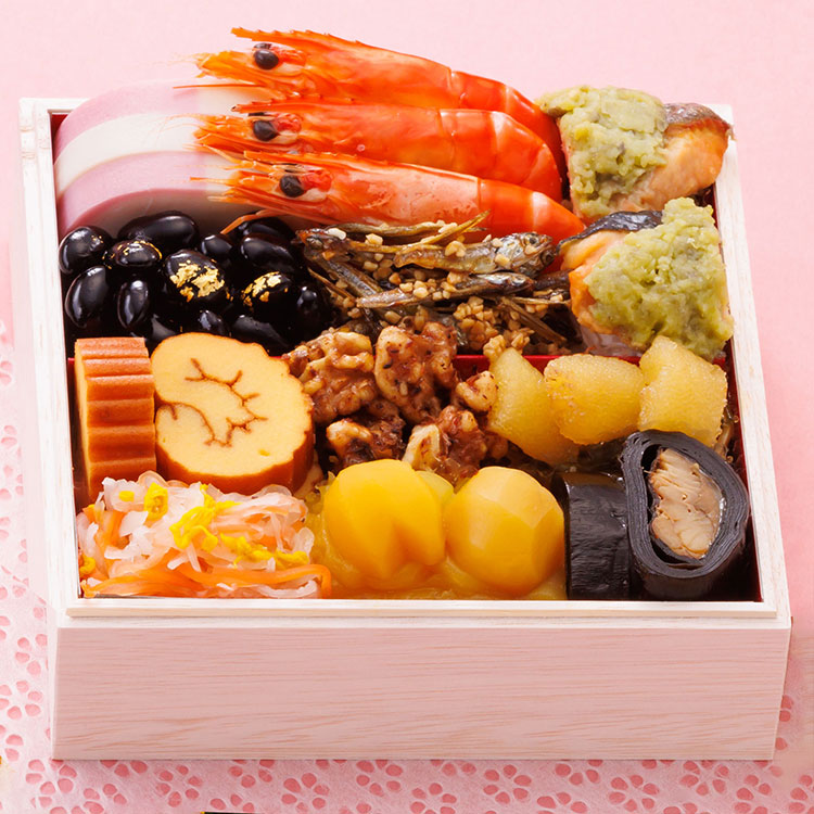 市松かまぼこ、浜汐えび、本鱒のずんだ焼、金箔黒豆、アーモンド入り田作り、伊達巻、くるみのかつお和え、数の子入り松前漬、菊花入り紅白なます、栗きんとん(甘露栗2個)、身欠きにしん昆布巻