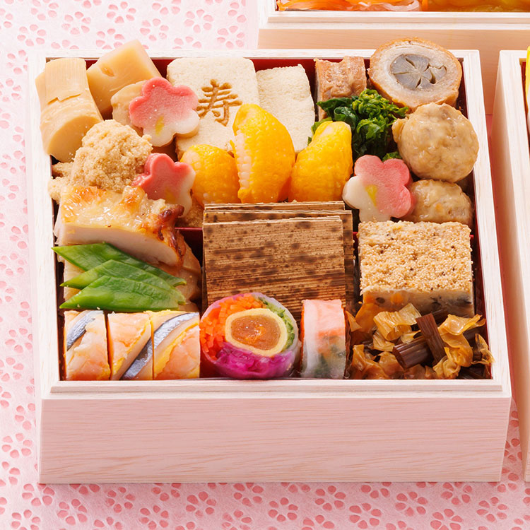 竹の子土佐煮、わかめ出汁漬、紅白梅麩、寿高野豆腐、豚八幡巻、菜の花福良漬、ぶりの子煮、松笠いか雲丹焼、蓮根入りつくねの照り煮、鶏の麹味噌漬焼、絹さや、乃し梅、山形県産きのこの松風、えびときびなごの手綱巻、彩りきぬた巻、ふきの佃煮 ゆば和え