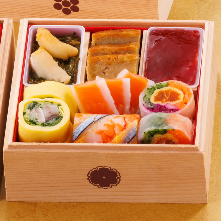 本鱒のずんだ焼、栗きんとん(甘露栗2個)、鶏の麹味噌漬焼、身欠きにしん昆布巻、竹の子土佐煮、わかめ出汁漬、紅白梅麩、菜の花福良漬、笹しぐれ、松笠いか雲丹焼、浜汐えび、伊達巻、蓮根入りつくねの照り煮、煮鮑、金箔黒豆、寄せ鰤子の湯葉巻