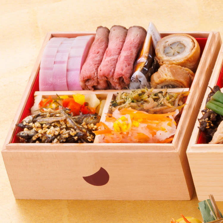 山形出身の店主、佐藤弘治氏が監修し、素材の味を大切にしながら彩り豊かに詰め合わせた豪華なおせちです。変則五段重のお重もユニーク。