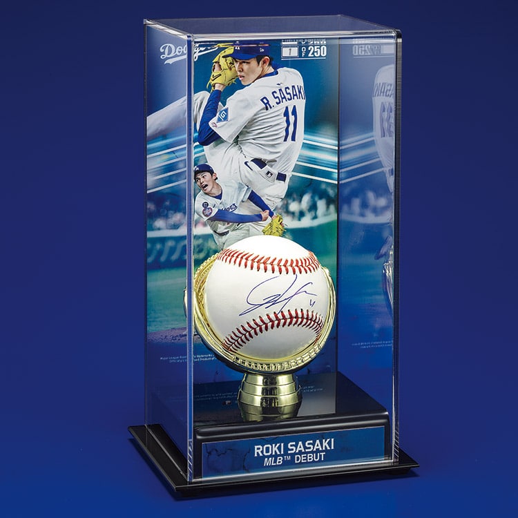 ロサンゼルス・ドジャース佐々木朗希投手のMLB™デビューを記念して、本人直筆のサインボールが、初登板当日の写真入り特製展示ケースとセットで特別提供されます。