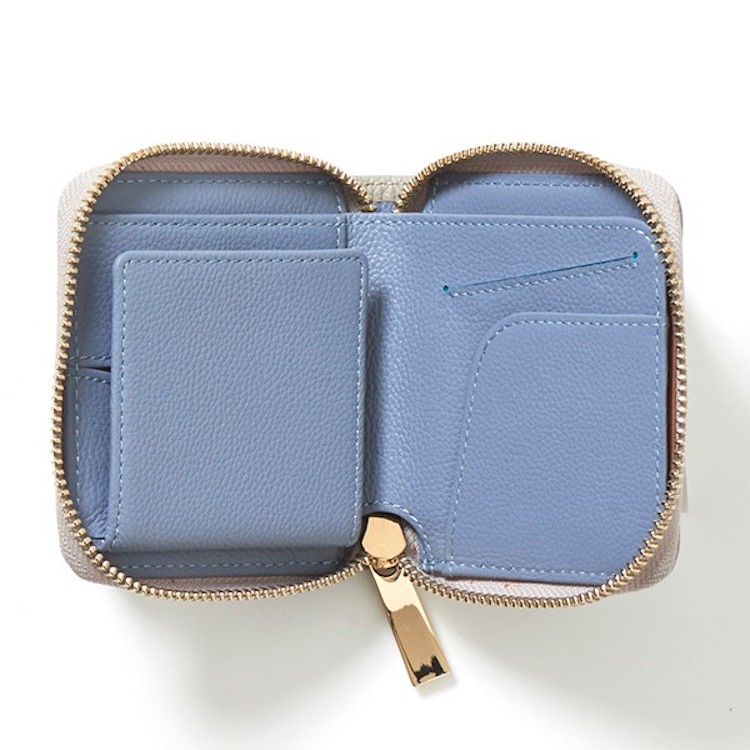 コンパクトで手のひらにすっぽり収まるのに、カードや紙幣、小銭がたっぷり入る実用性の高さが自慢です。ラウンドファスナー式なので、さっと開閉でき、紙幣と小銭が一度に取り出せるように札入れと小銭入れの開口部の向きを統一。開けた瞬間に、お札と小銭を取り出せます。