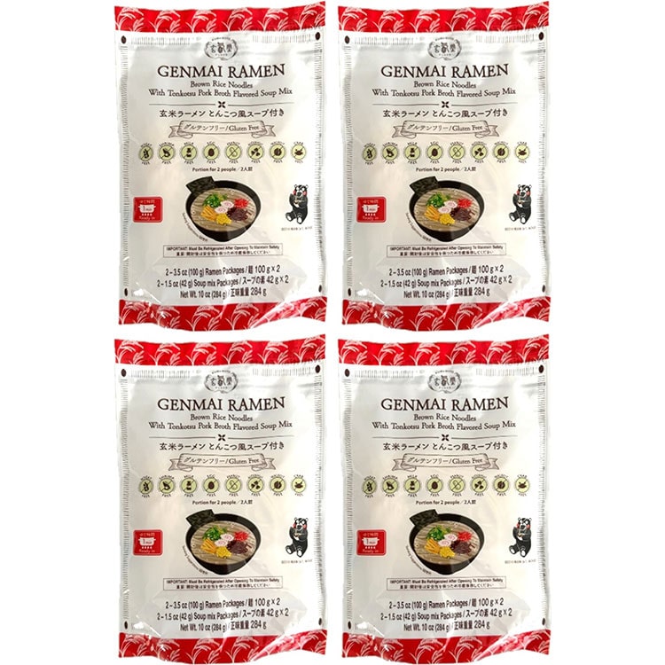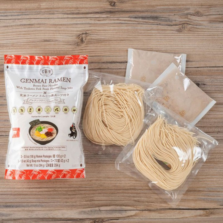 熊本県産の玄米を使用し、玄米の栄養をまるごと含んだグルテンフリーの玄米ラーメン、本格的な豚骨風スープ(グルテンフリー)付き。