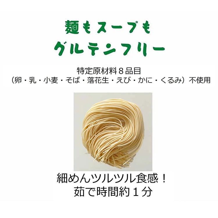 特定原材料8品目不使用、細麺でツルツル食感です。必ず沸騰したお湯でゆでて下さい。茹で時間は約1分です。