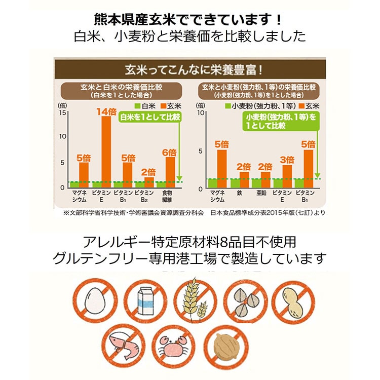 ミネラルやビタミンなどの豊富な栄養が含まれている米ぬかの部分までを丸ごと使っている栄養価の高いグルテンフリーです。アレルギー特定原材料8品目不使用の専用工場で安心安全に製造しています!