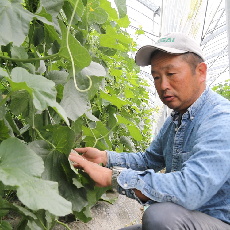 メロンの名産地・熊本県で、永松農園の永松さんが情熱を込めて育てています。微生物が活発な「生きた土」にこだわり、農薬を30%削減。1株2玉に栄養を凝縮させた一玉は、職人の技が光る至福の甘さです。