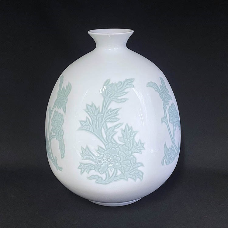 - > [井上萬二]陶芸『白磁緑釉牡丹彫文面取壷』